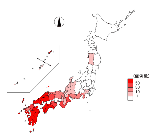 2025年には、これまで報告のなかった秋田県・神奈川県・岐阜県から新たに届け出があり、神奈川県と岐阜県が推定感染地域として追加されました。