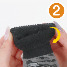 靴下を半分に折り、開口部を広げて足を入れやすくします。