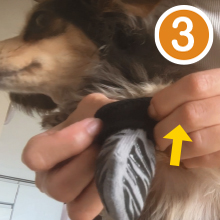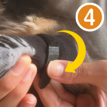 犬の足を開口部に入れ、靴下の半分に折っていた部分をゆっくり伸ばしていきます。靴下がしっかり足全体にフィットしていることを確認します。